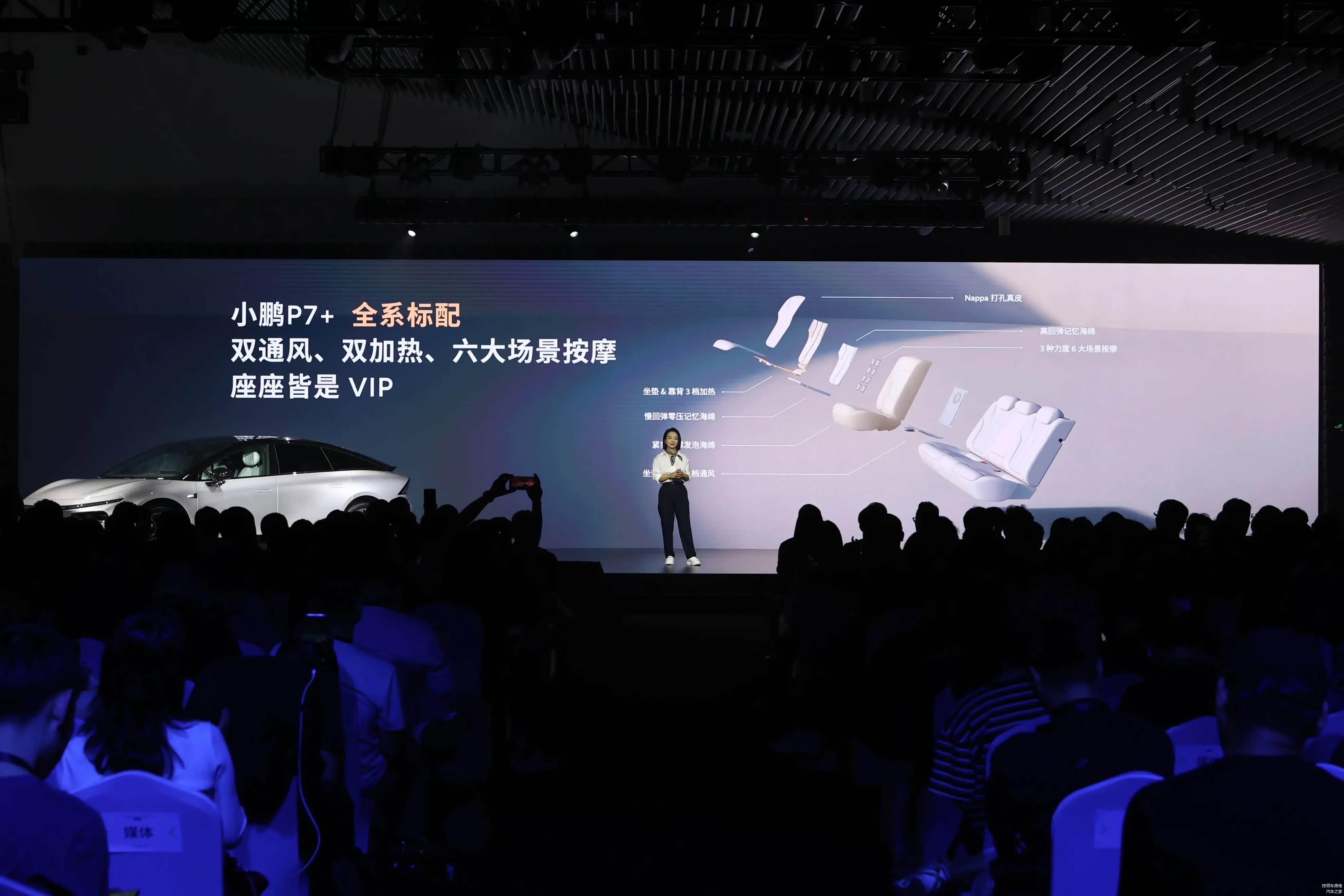 小鹏P7+采用全新云感舒适座椅2.0,全系标配四座双通风、双加热、六大场景按摩功能,并且标配后排座椅10°电动的无级调节,调节范围是27°~37°。
