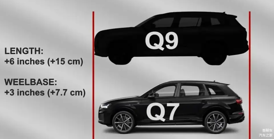和外观一样,内饰上也颠覆了我们对奥迪的常规认知。方向盘与奥迪的纯电版一致,采用了四幅式设计,触控式按键也带来了更好的科技感!显示区由两只大尺寸的悬浮屏组成,其中副驾驶还可选装娱乐屏,至于其它方面,因为被全部掩盖,所以有效信息并不多!我们从下图能清楚的看到这款Q9与Q7在尺寸上的区别,所以大七座已经成为定局。