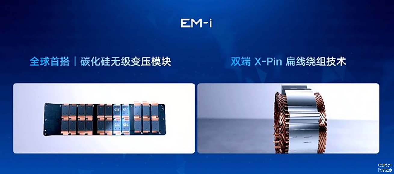 EM-i系统中的电机同样经过了深度定制化设计,采用双端X-pin油冷扁线绕组技术的P3电机,不仅缩短了轴向长度,减少了铜线端部高度,还显著降低了能量损耗,电机效率最高达到98.02%。值得注意的是,EM-i系统中加入了SiC升压模块,有效解决了馈电状态下动力不足的问题,使得车辆即使在电池电量较低的情况下,也能保持良好的动力输出。通常来说,15万元级的插混车型,都不会给到SiC升压模块,这方面吉利要更为厚道。