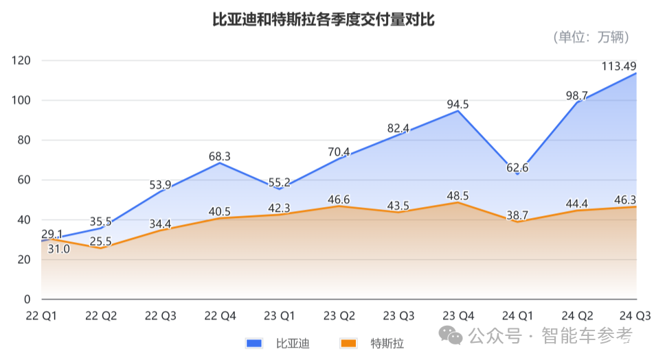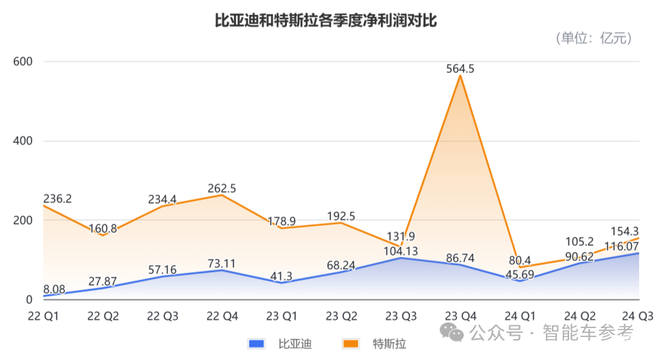第三季度,比亚迪的归母净利润为116.07亿元,同比增长11.5%,环比增长28%;而特斯拉的GAAP净利润为154.3亿元,同比增长16.9%,环比增长46.7%。