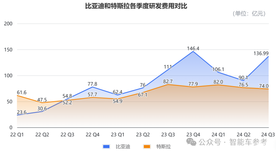 第三季度,比亚迪研发费用为137亿元,同比增长23.4%,环比增长52%,相当于每天要投入1.5亿元到研发当中。