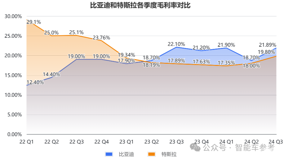 比亚迪的毛利率水平更高,第三季度毛利率为21.89%,而特斯拉的毛利率则是19.8%。
