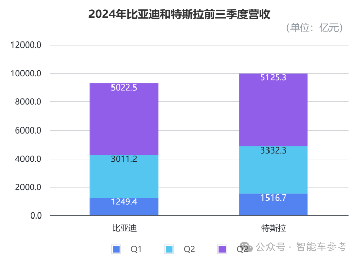 总体来看前三季度,比亚迪总营收为5022.51亿元,同比增长18.94%;而特斯拉三个季度总营收为5125.3亿元,同比增长0.53%,双方营收差距不到100亿元。