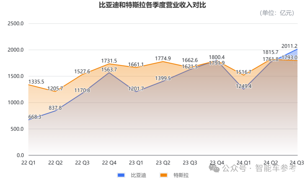 这是历史上首次,比亚迪的营业收入明显超越了特斯拉。
