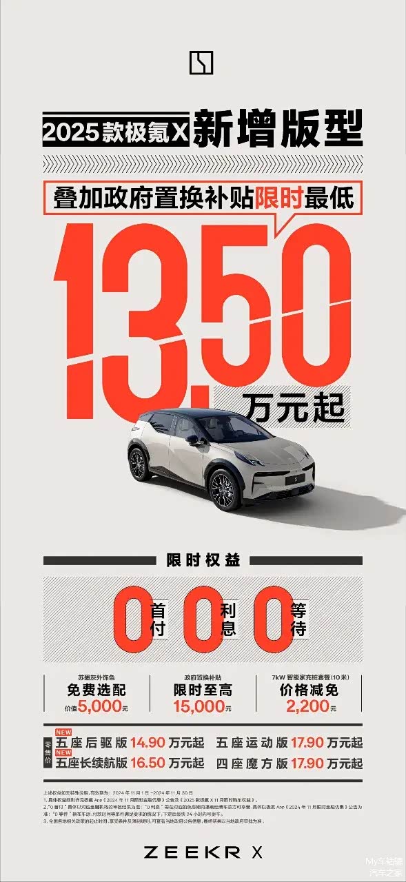 值得一提的是,极氪X新增两款车型,售价14.9万起,不到15万元的入手门槛。而且通过选择1000元限定巴黎玄米或者杭青绿外饰颜色,可获得15000元的政府置换补贴。也就是说,现在叠加政府补贴,这台热门纯电精品小车限时13.5万起就能开回家,且最低日供仅需82元。面对大众ID.3和比亚迪元PLUS两大对手,极氪X用20万的产品价值实现降维打击,预计会对销量有很大的提升作用。