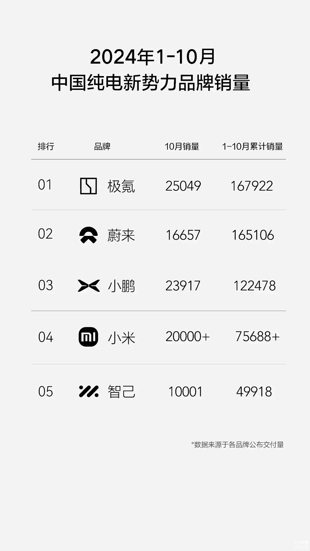 在刚刚过去的10月份,极氪交付新车25049台,连续两个月交付突破2万台!虽然在网络舆论场上,鸿蒙智行、小米等风头正盛,但低调造车的极氪在销量榜单上也从未输过,无论是月榜还是周榜,都有王牌车型跻身前十行列。