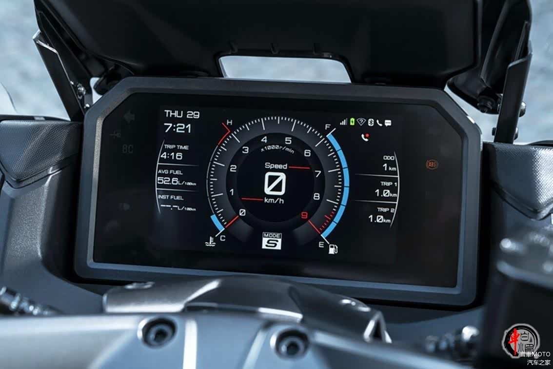 功能配置方面,2025款TMAX前后灯组依然采用LED光源,尾灯标志性的T造型设计,尤为醒目。车机电控方面采用了全新设计的的7英寸TFT全彩液晶仪表,不仅尺寸更大,而且还提供了丰富的车辆信息,支持蓝牙连接、车机互联,让驾驶者能够更直观地获取车辆信息。此外,无钥匙启动系统也进行了升级,加入了电子支架锁定功能,让启动更加便捷。