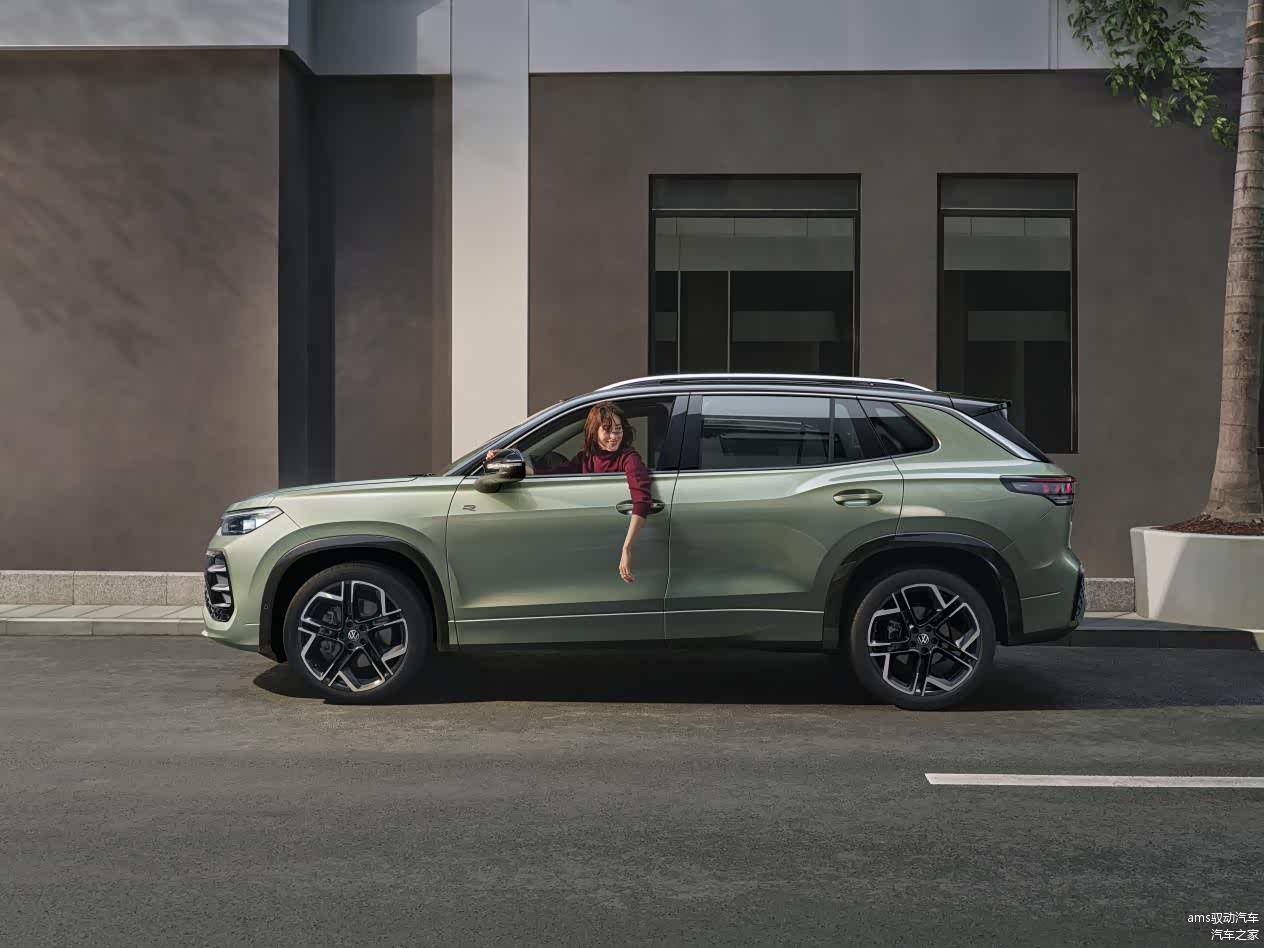 车尾部分,则采用了贯穿式尾灯,车顶配备有尺寸比较大的扰流板以及高位刹车灯。同时,新车尾门中间位置“TAYRON L”标识表明身份信息。值得注意的是,R-Line版本后包围巧妙融入菱形元素,与前脸设计完美呼应,进一步强化了车辆的运动化属性。