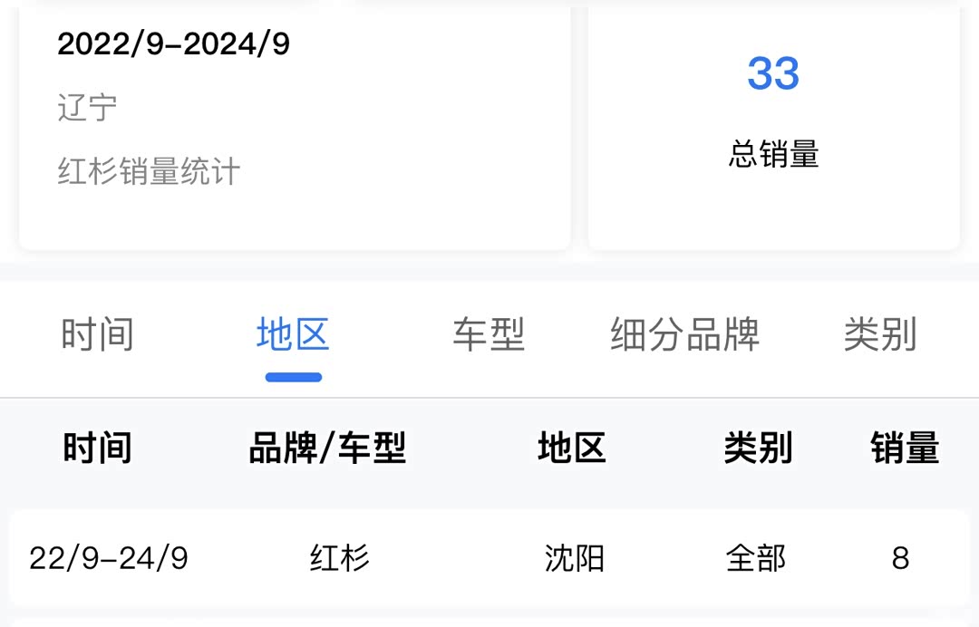 数据显示,从2017年1月到2024年9月,丰田红杉在中国大陆的销量为2622辆,93个月才卖2622辆,平均一个月仅为28.19辆,而整个辽宁省的总销量仅为36辆,考虑到第三代丰田红杉是2022年9月开始生产的,如果减去2022年9月之前的销量,那么,从2022年9月到2024年9月,丰田红杉在辽宁省的总销量仅为33辆,沈阳市仅为8辆,所以说,赵一楠的丰田红杉在沈阳市不太容易撞衫,就算遇到了同款车,颜色也未必一样。