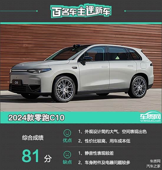 在日益“内卷”的国内汽车市场中,零跑绝对算是一家特点鲜明的造车新势力品牌,始终坚持以“性价比”为核心卖点。虽然“价格战”并非是一种积极向上的竞争手段,但是客观来说,想要在竞争如此激烈的环境中站稳脚跟,首先还是要保证自己能够生存下去。作为零跑在中型SUV领域投放的第二款产品, 零跑C10(图片 | 参数 | 询价)继续高举“性价比”的大旗,可谓是量大务实且诚意满满。根据参与本期“百名车主评新车”调查的车主反馈,2024款零跑C10在外观设计、空间表现以及性价比方面广受好评,但也有部分消费者反映其静音性表现较差,且车身附件及电器问题较多。