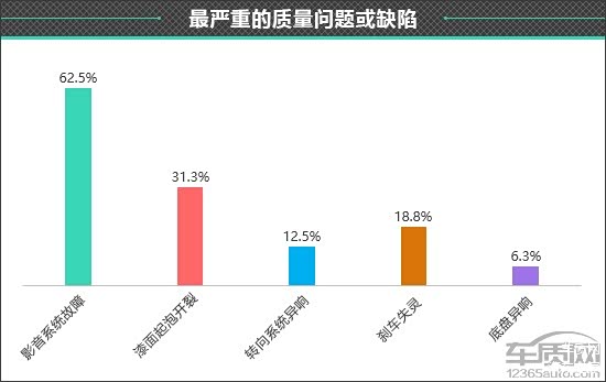 在对车主的进一步调查中我们发现,车身附件及电器出现非人为故障的占比相对较高,这也体现在“这款车最严重的质量问题或缺陷”调查结果中。经调查发现,车主对于2024款零跑C10在“影音系统故障”方面的抱怨较多,占比高达62.5%。