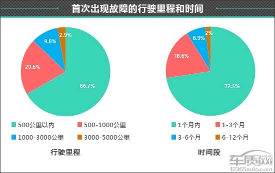 在这些出现非人为故障的车辆中,首次出现故障行驶里程在500公里以内的占比最多,达到66.7%。而对于首次出现故障时间段的调查结果显示,有超过七成的车主表示,车辆在购车1个月内便出现了故障。