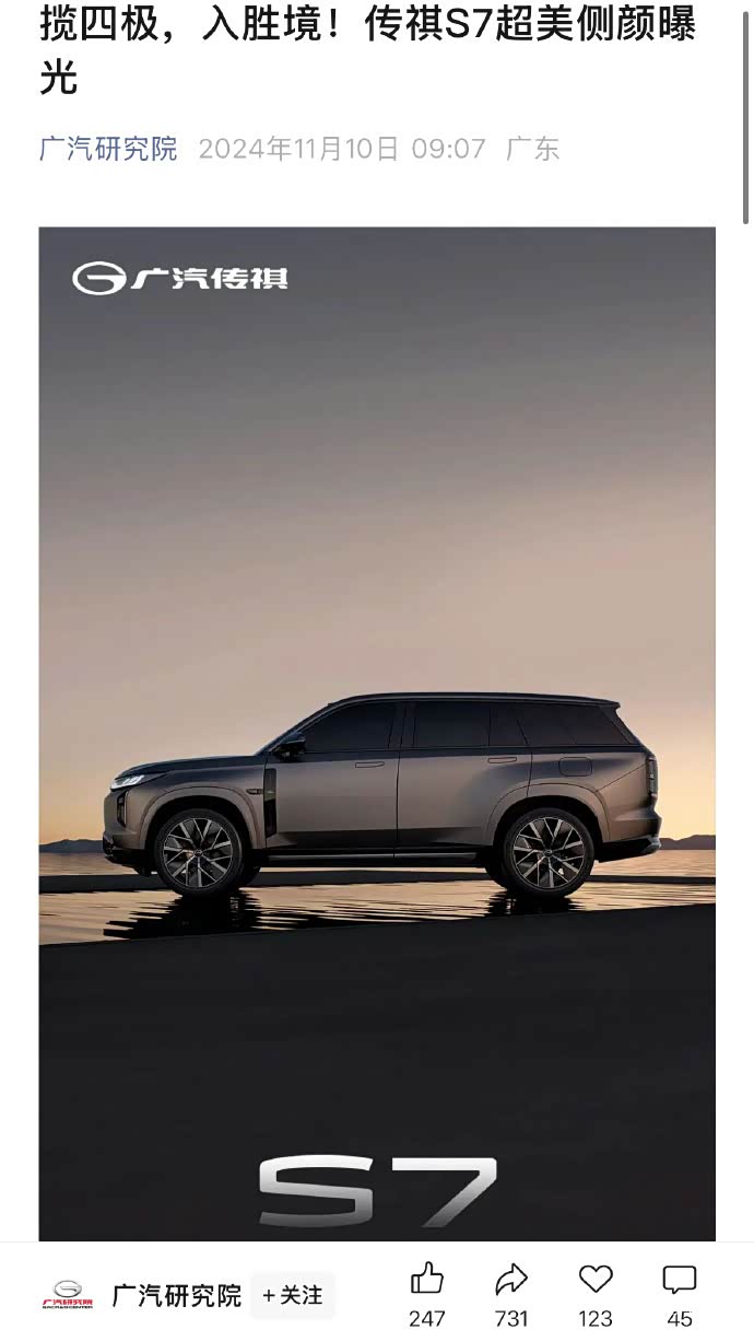11月10日,广汽传祺在官方社交媒体账号上发布了一款全新车型的侧面图片,这款车是广汽传祺S7,可能很多小伙伴已经看到了,这款车的侧面和路虎揽胜特别相似,你以为这是错觉,这可不是错觉!因为这则推文的标题开头就是6个字:揽四极,入胜境!
