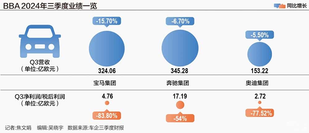 作为BBA最主要的汽车市场,中国市场的销量劲减,极大地影响了它们的营收和利润。以今年第三季度为例,奔驰、宝马、奥迪的营收,分别为345.28亿欧元、153.22亿欧元、324.06亿欧元,同比分别下滑6.7%、15.7%、5.5%;净利润分别为17.19亿欧元、4.76亿欧元、2.72亿欧元,同比分别暴跌54%、83.80%、77.52%。BBA净利润下跌幅度如此之大,令人触目惊心。中国市场需求走低,让BBA面临巨大业绩压力。