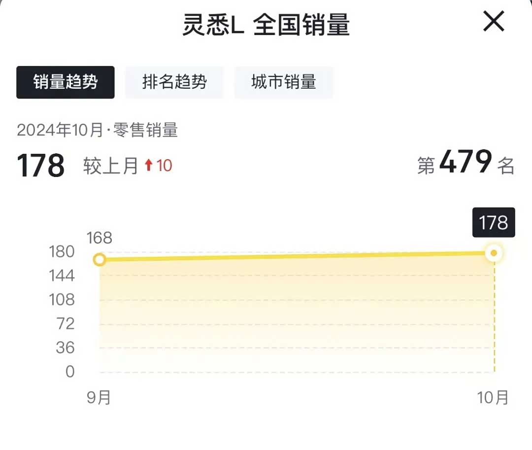 灵悉L上市后的市场表现,9月销量168辆,10月销量178辆,不出意外,又是一款失败的新能源产品。一款产品力不行的车型,只能被竞品按在地上摩擦,灵悉L从上市开始就确定了结果。大家说呢?