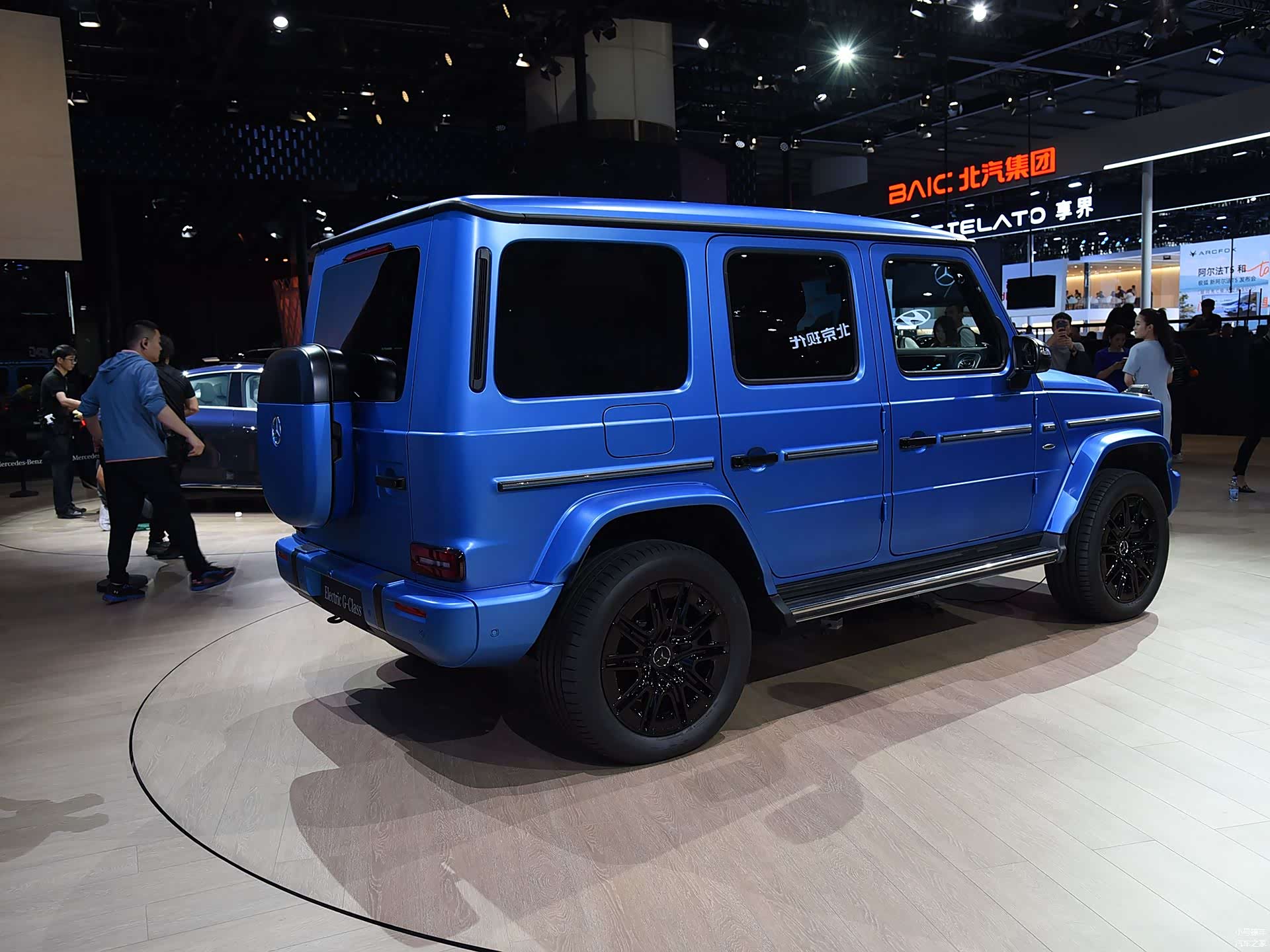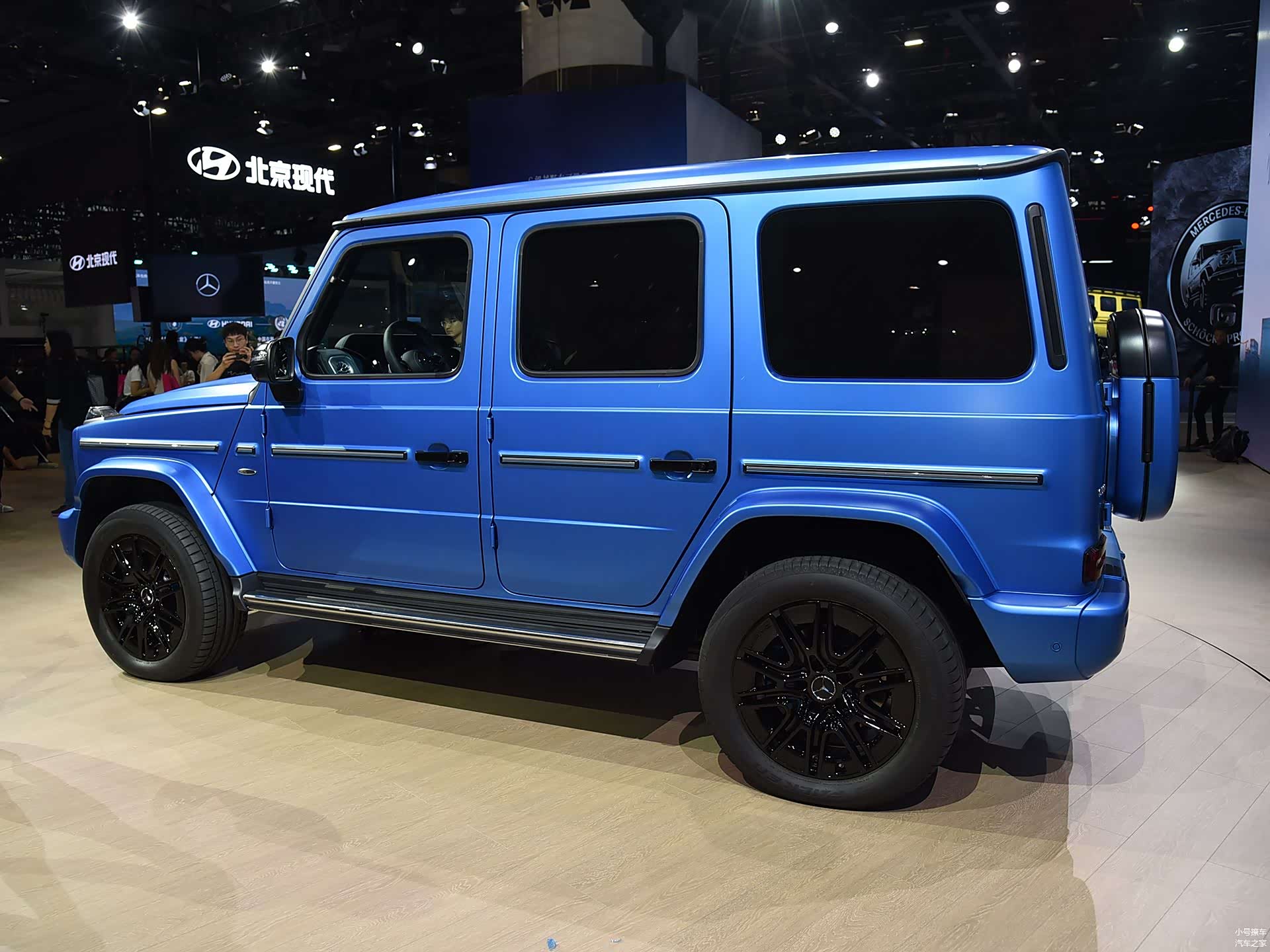 车身侧面的造型比较方正,和燃油版奔驰奔驰G级基本上保持一致,有着浓浓的硬派气息;腰线采用的是贯穿式设计,点缀出了车身侧面的层次感;轮眉和侧裙部分的造型都比较硬朗,让车身看起来比较魁梧;轮毂采用了熏黑的多幅式造型,与之搭配的是275/50 R20规格的轮胎。
