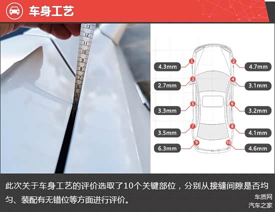 在车身工艺测试环节,整车共选取10个关键部位,每个关键部位都会选取3个关键点进行测量,以评价各关键部位缝隙的均匀程度。从测试结果来看,评测车两侧前翼子板与发动机舱盖连接处、两侧后翼子板与后备厢连接处缝隙均值偏高,并且后翼子板与后备厢连接处还存在左右缝隙均值相差较大的情况,对最终测试成绩造成一定影响。