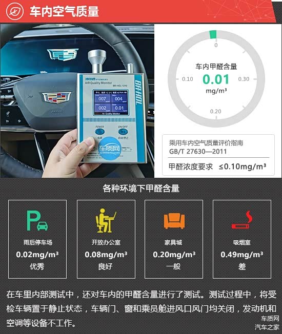在车内空气质量测试环节,将车辆放置在车辆较少的内部地面停车场中,实测2025款凯迪拉克XT5的车内甲醛含量为0.01mg/m3,符合2012年3月1日起实施的,由原环保部和国家质量监督检验检疫总局联合发布的《乘用车内空气质量评价指南》(中华人民共和国国家标准GB/T 27630-2011)中的相关标准。