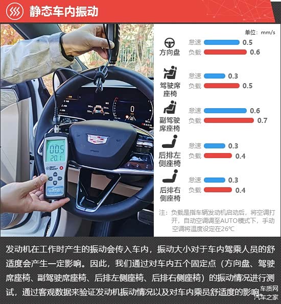 在静态车内振动测试环节,怠速状态下,2025款凯迪拉克XT5方向盘和副驾驶座椅的测试数值略高于其他部位。负载状态下,所有部位的振动数值均出现小幅升高,实际体感略微明显。