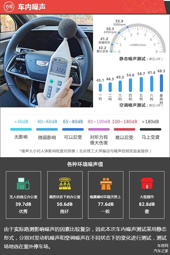 在静态噪声测试环节,2025款凯迪拉克XT5在静止状态下车内实测噪声值为32.2dB。随着发动机启动,传入车内的噪声值呈现出逐渐增大的趋势,从测试数据来看,发动机在怠速、2000转和3000转时,传入车内的噪声值分别为41.2dB、50.3dB和55.9dB,均处于合理范围。