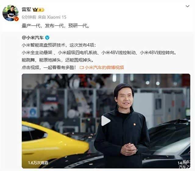 雷军在社交平台上的一席话,更是将这场营销推向了高潮。他提到:“量产一代,发布一代,预研一代。”这句话不仅展示了小米汽车在技术研发上的前瞻性和实力,也展示了小米的自信。