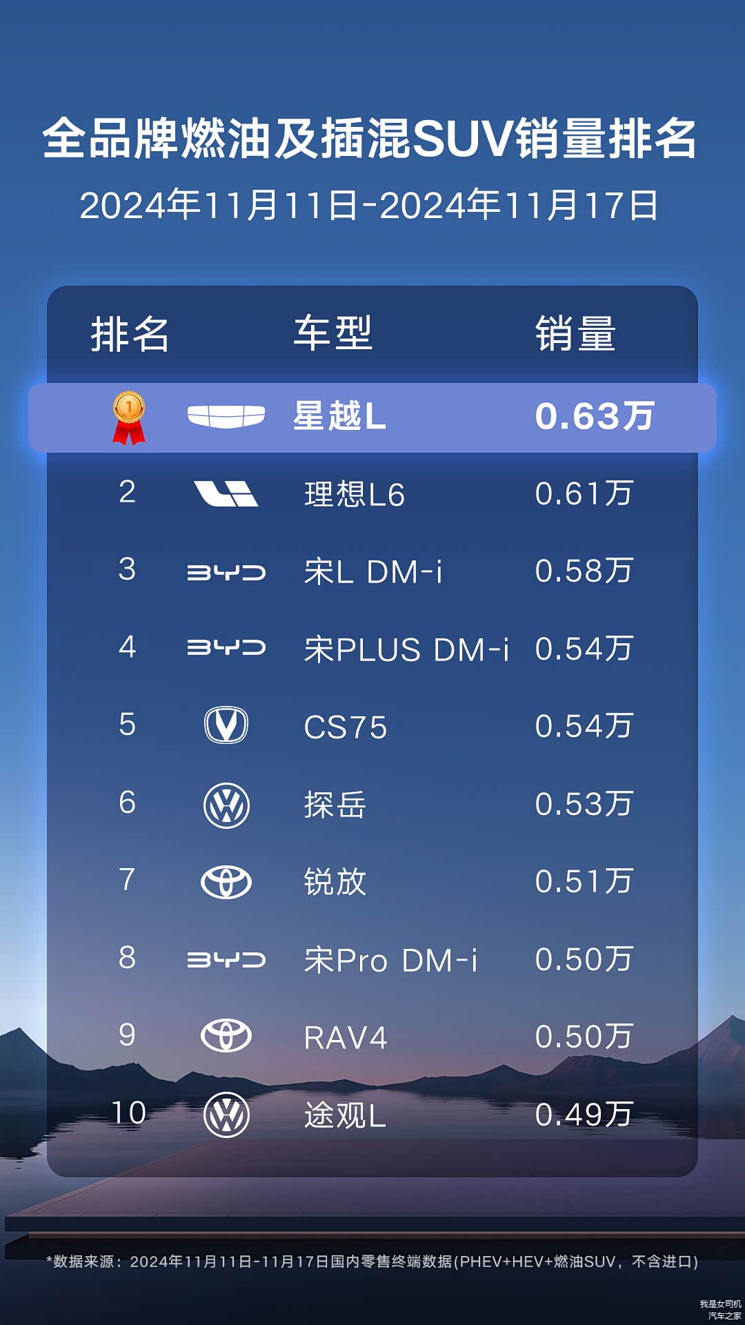 11月11日至17日,星越L再夺全品牌燃油及插混SUV销量第一。这不禁让人好奇,星越L凭什么能连续几个月蝉联销量冠军?