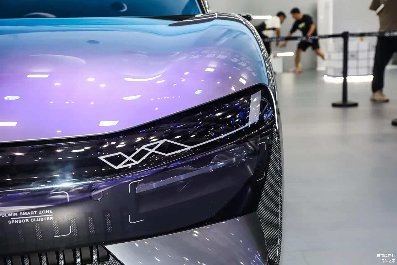 外观方面,整车造型激进科幻,车头是用黑色封闭式格栅打造,中间藏着智能化设备的传感器集群,灯组分成上下两层,上层日行灯设计成几何线条,曲折醒目,前照灯横向布局,尺寸不大,车头内凹,前唇突出,有着很强的立体感,采用碳纤维材质打造,成本较高。