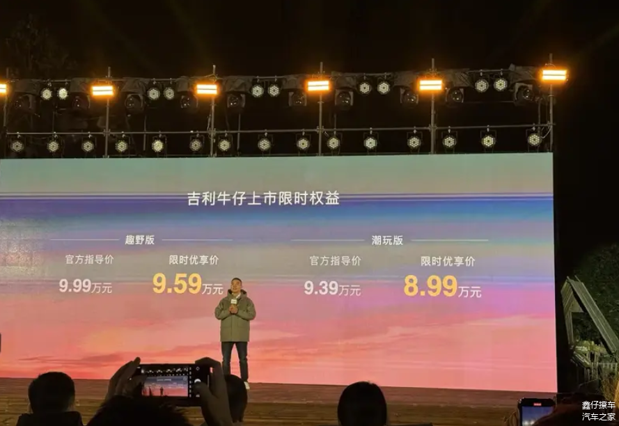 11月20日,吉利汽车官方宣布吉利牛仔正式上市。新车共推出2款车型,官方指导价9.59-9.99万元,限时优享价8.99-9.59万元。作为吉利首款轻越野SUV,吉利牛仔首次采用了全新潮流越野方盒子造型设计。
