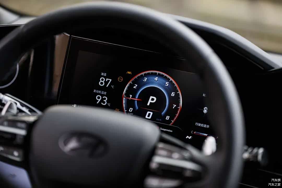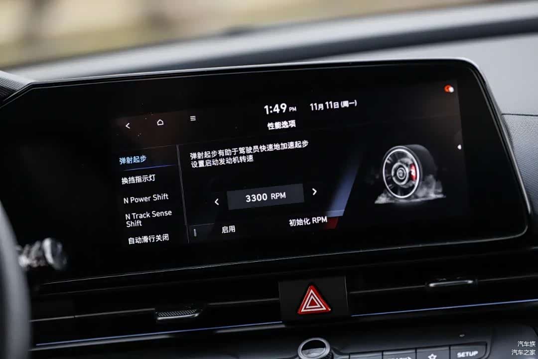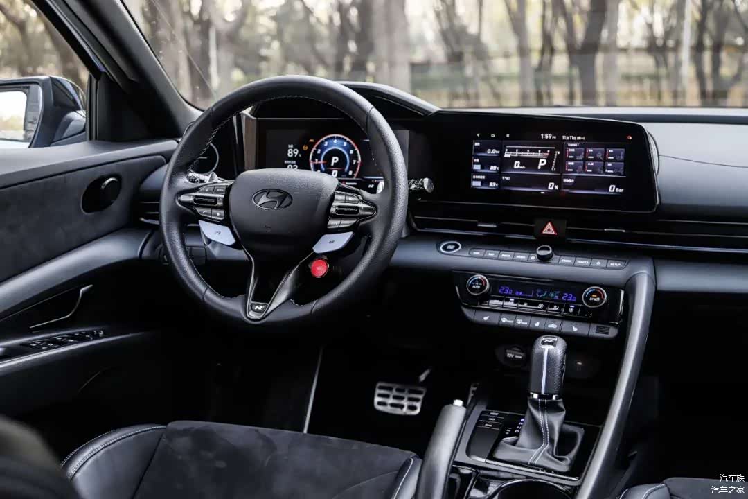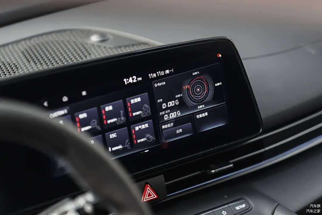 内饰整体造型和伊兰特也基本一样,以驾驶员为中心,只是在视觉呈现上做了性能化的提升。打孔真皮方向盘一边两个N自定义按键+NGS按钮,同样10.25英寸仪表盘和中控屏都有N的专属界面,中控屏界面除了有关性能的数据显示,还能自定义调节百公里加速时的起步转速,这点还是挺有意思的。