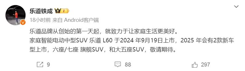 日前,乐道汽车总裁艾铁成在微博表示,乐道汽车2025年会有2款新车型上市,分别为六座/七座旗舰SUV,和大五座SUV。