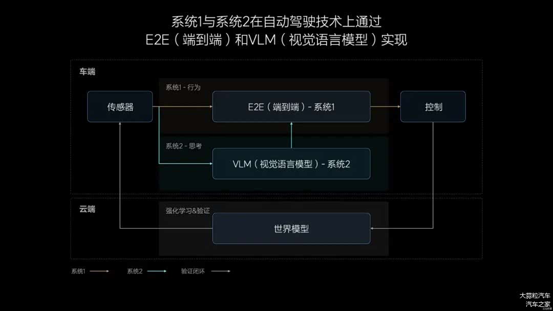 探寻更高的上限和更高的下限,在2024年下半年,行业也逐渐形成共识,其中一种路径是世界模型,另一种方式则是运行车端的双系统,比如视觉语言模型(VLM)或者视觉语言动作模型(VLA)。