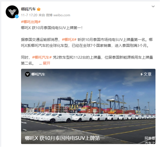 的确,对于当下的哪吒汽车来说,冲击海外是其IPO的重要筹码,甚至给人放弃国内市场的意味。这点在其官方微博上就能看出——在大家都在公布10月成绩的时候,唯独哪吒汽车公布的是:泰国纯电SUV销量第一。