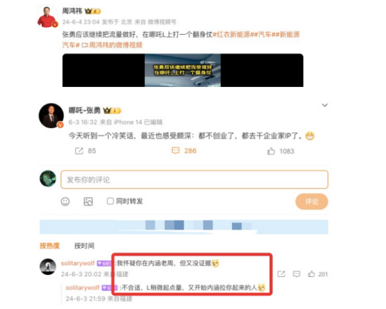 所以再回看今年周鸿祎和哪吒短暂的蜜月期,也难怪有人认为周鸿祎这样造势,是为亲自下场造车做准备,哪吒只是垫脚石。不过更多人认为,周鸿祎和张勇之间理念造成的隔阂:周鸿祎希望张勇做好流量,在哪吒L上打一个翻身仗,而张勇则执着的梭哈外海,更被指暗周鸿祎,接着是一系列暴雷,最终造成哪吒被流量所抛弃。