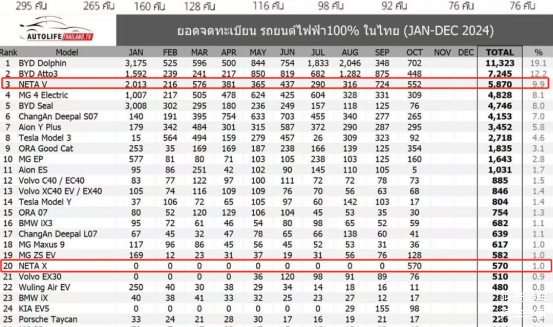只不过受限于泰国市场的体量,哪吒汽车10月在泰国的上牌量只有1122台,上榜车型是哪吒V和哪吒X,数据分别为552辆和570辆,整体基数还是偏小。而且最为难的是,泰国市场里最占优势的中国品牌依旧是比亚迪!如下图所示,10月份销量TOP5里比亚迪就占据三款,分别是海豚、Atto3(国内为元PLUS)、海豹,哪吒V仅排第三,累计销量也5870辆。