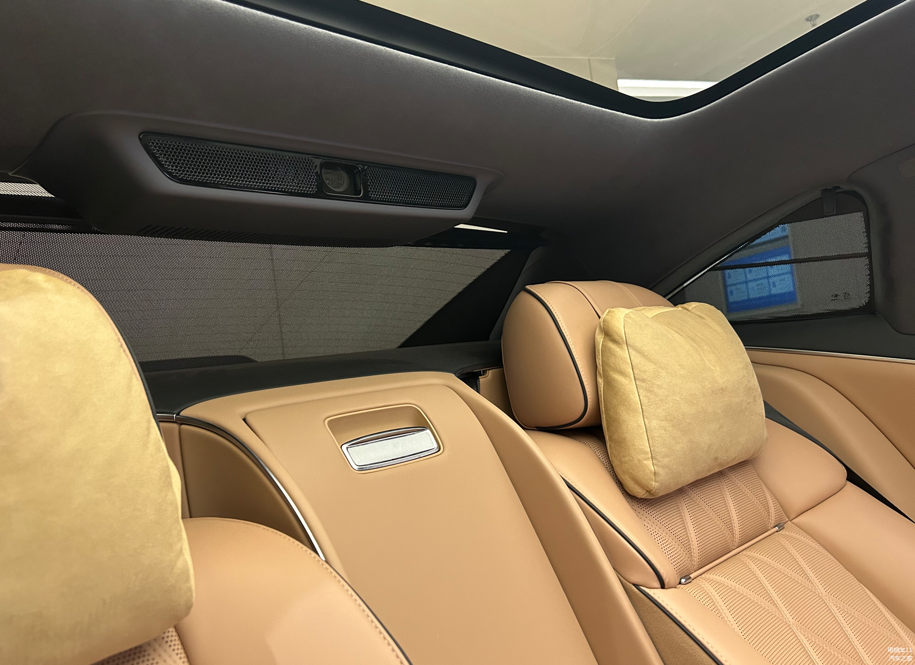 第二,很多人都会说,享界S9又不是SUV,为什么要把原本完整的全景天窗做成两块呢?而这个玄机就在两块玻璃中间的投影仪,准确的说,这是投影仪的幕布,因为它的投影仪位于车尾的上方。幕布放下的时候,其实还可以当作隔绝前后座位的屏障,在这里谈个生意私密性还是很好的,另外两侧的隐私玻璃再加上可以关闭的全景天窗,正好为投影仪提供一个非常良好的暗光环境。从我们的实际体验来看,总体效果其实比屏幕更好,毕竟它更大,收起来之后也完全不占用空间,看起来也不容易晕车。