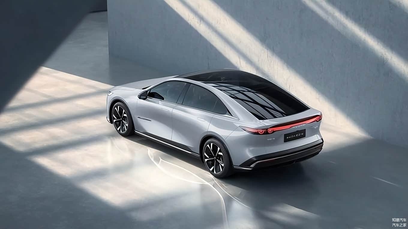 车身侧面,长安马自达EZ-6采用主流的溜背轿跑造型,同时整个车身为短前后悬设计,给人俯冲向前的气势,无框车门及隐藏式门把手提升整车的时尚气质。