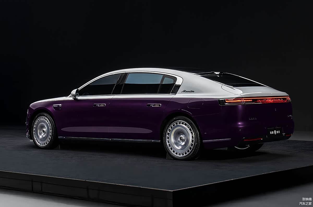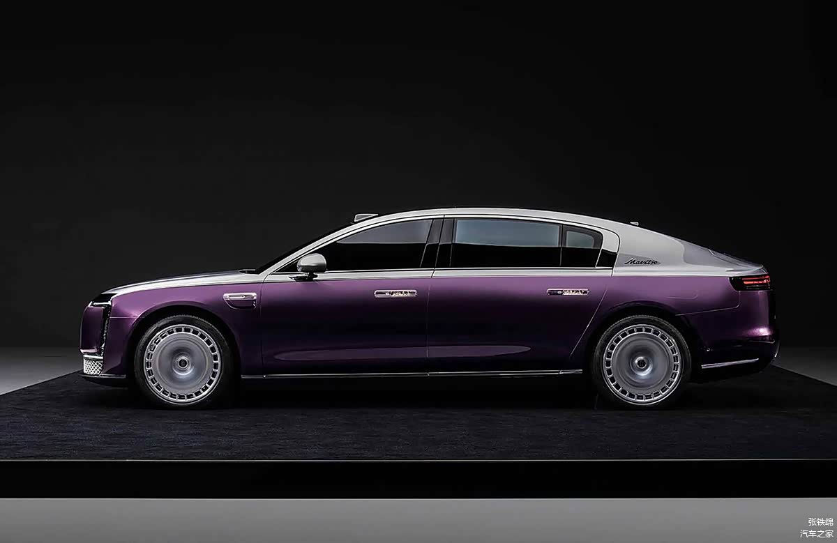 车身侧面造型很修长舒展,使用了长车头短前悬的比例结构,而尾部则是溜背式的造型,增加了运动感。车窗使用了全框式的镀铬饰条,镀铬饰条在后侧窗后侧加宽,增加了豪华感。C柱造型很宽厚,带有尊界品牌的字母拼音Maextro。车身线条很简洁圆润,腰线过渡很圆润。