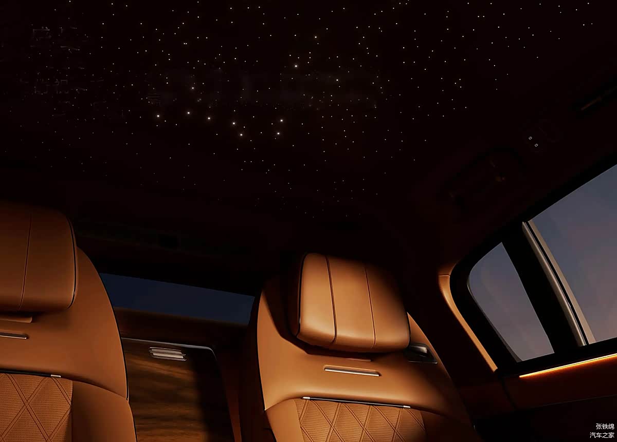 目前新车的内饰部分还未公开,只公布了一张后排官图,新车使用了2+2座椅布局,后排是两个大沙发式的座椅,两个座椅靠背中间带有储物箱,车顶是全景天幕,还提供了星空效果的氛围灯,营造出了不错的豪华感。