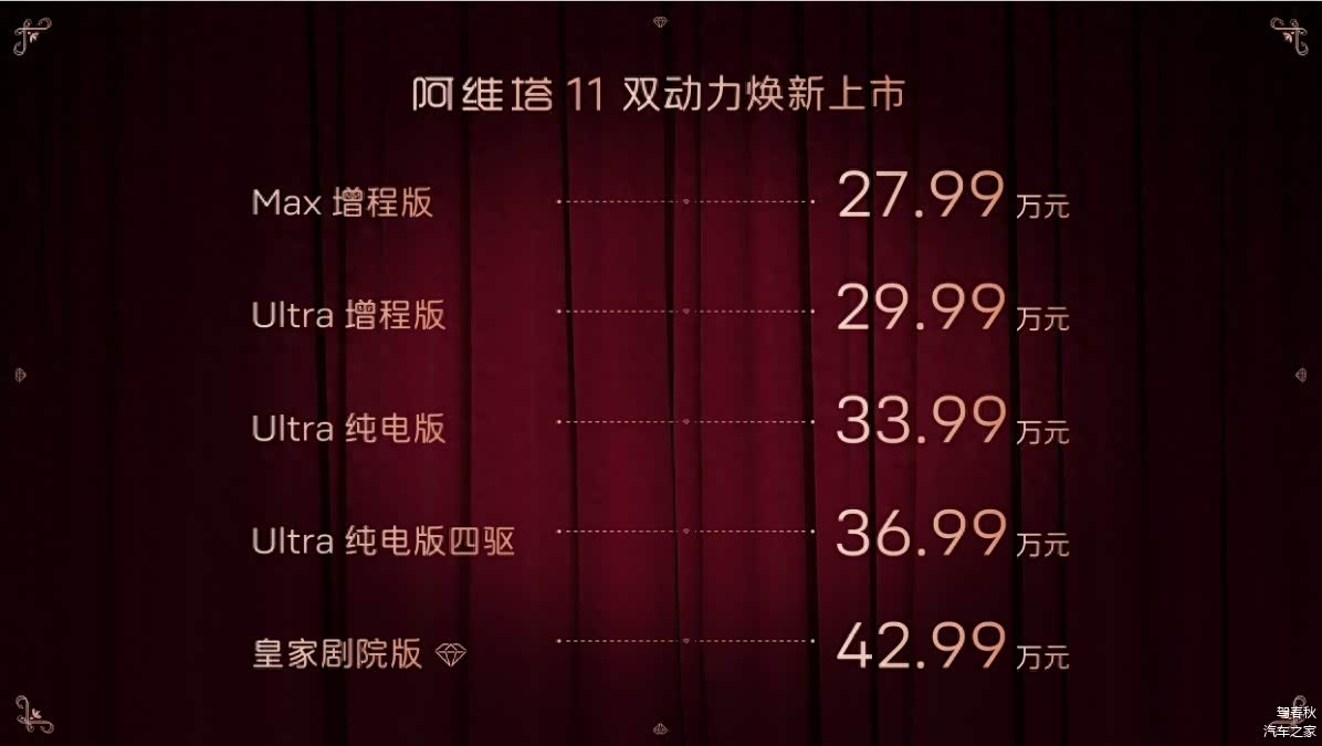 就在刚刚,阿维塔旗下首款SUV车型—— 阿维塔11(图片 | 参数 | 询价)迎来了增程和纯电版双动力的全新上市,其中增程版两款,起售价格27.99万元;纯电版三款,起售价为33.99万元,另外皇家剧院版也是纯电版本,售价42.99万元。续航来看,纯电版本的最高续航为815km,增程版车型的最高综合续航达到了1065km。