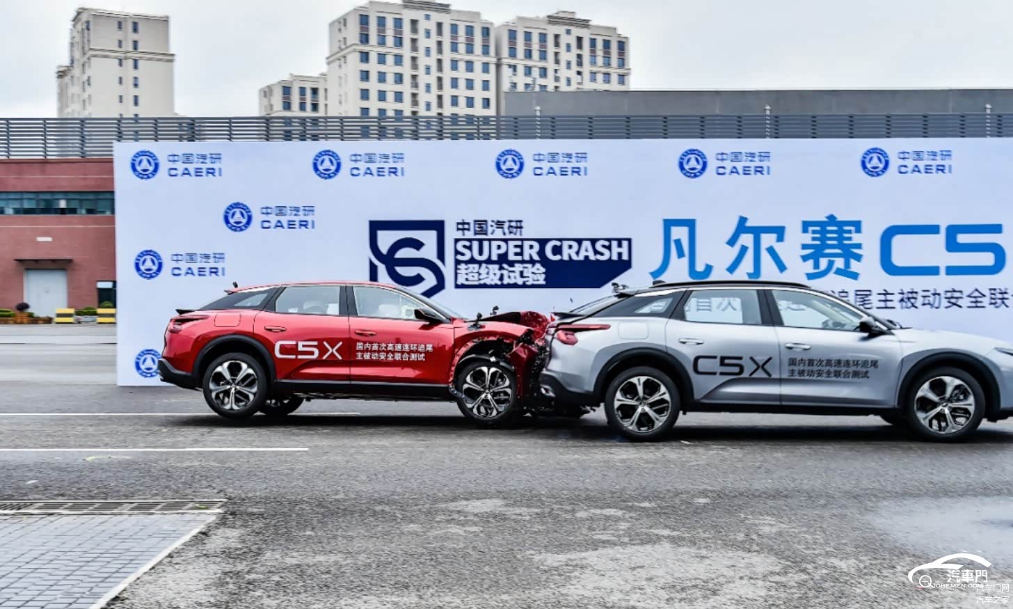 为检验汽车被动安全性,东风雪铁龙旗下凡尔赛 C5 X为模拟高速连环追尾,此次碰撞测试共使用三台车。其中,凡尔赛C5 X二号车追尾静止不动的一号车,测试被动安全;三号车将开启AEB功能,追向二号车,测试主动安全性能,以此模拟高速连环追尾测试。