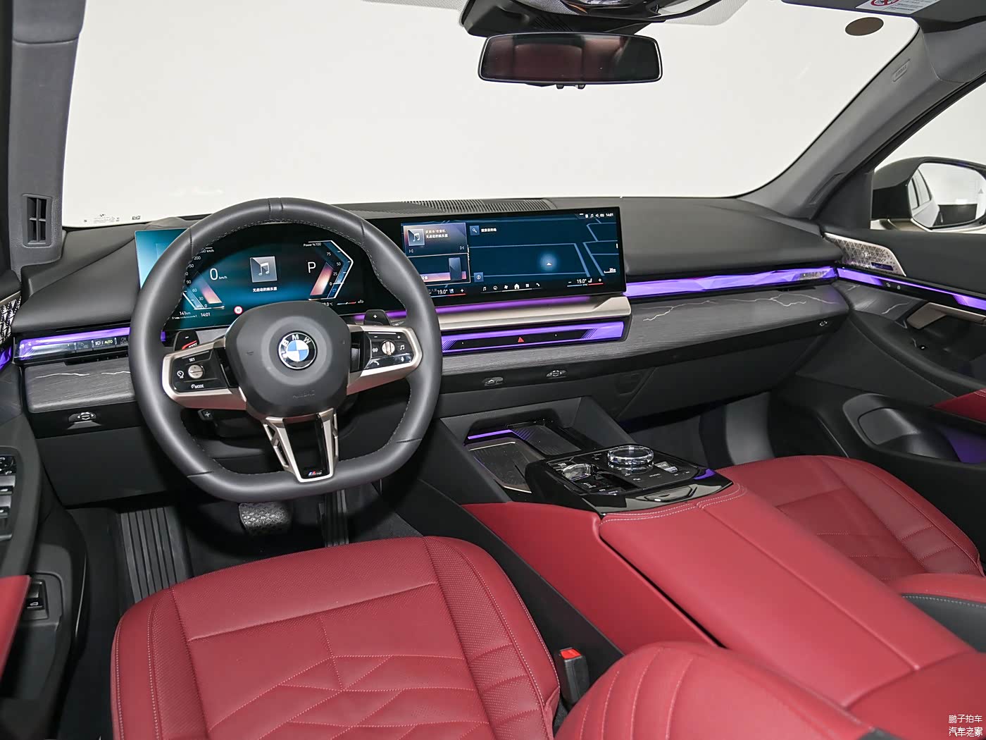 外观说完了,我们再来看看内饰,全新BMW 5系采用了极简的风格设计,几乎取消了所有的传统实体按键,方方正正的双联屏(全液晶仪表12.3英寸+14.9英寸中控屏)、中间的“水晶”氛围灯条,包括M运动套装的方向盘都和大哥7系完全一样,内置的是高通骁龙8155芯片,搭载了宝马最新的iDrive 7.0车机系统,像手机互联映射、OTA升级、语音分区控制等功能都是有的,操作逻辑、流畅度和当下的新能源汽车不相上下,另外,高级真皮座椅、木纹装饰、精致缝线等细节都体现了BMW一贯的工艺水准。值得一提的是,全新BMW 5系这次也玩起了豪华感,水晶灯条从中控贯穿两侧车门处,在多色环境氛围灯的加持下,完全不输老对手奔驰E级。