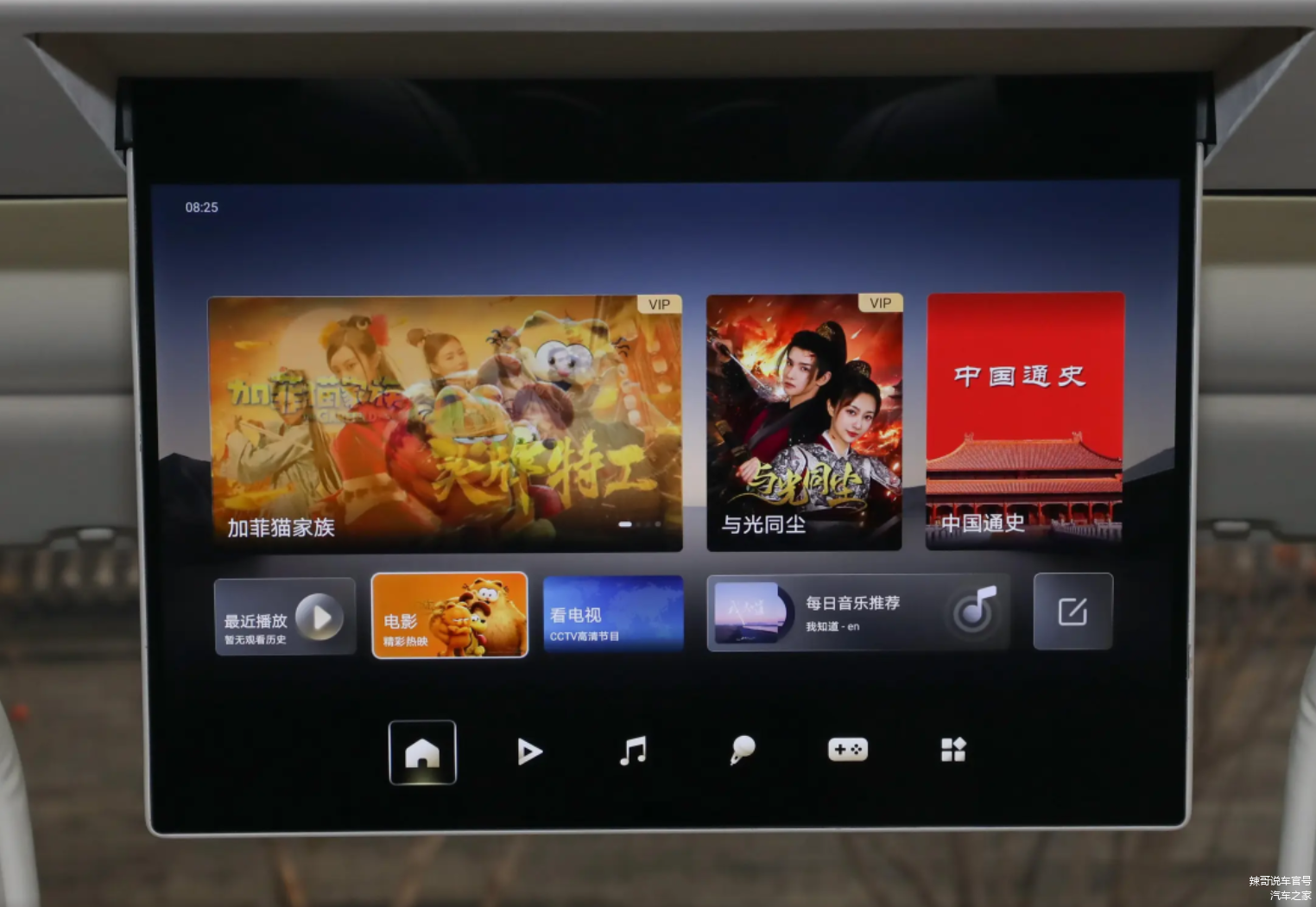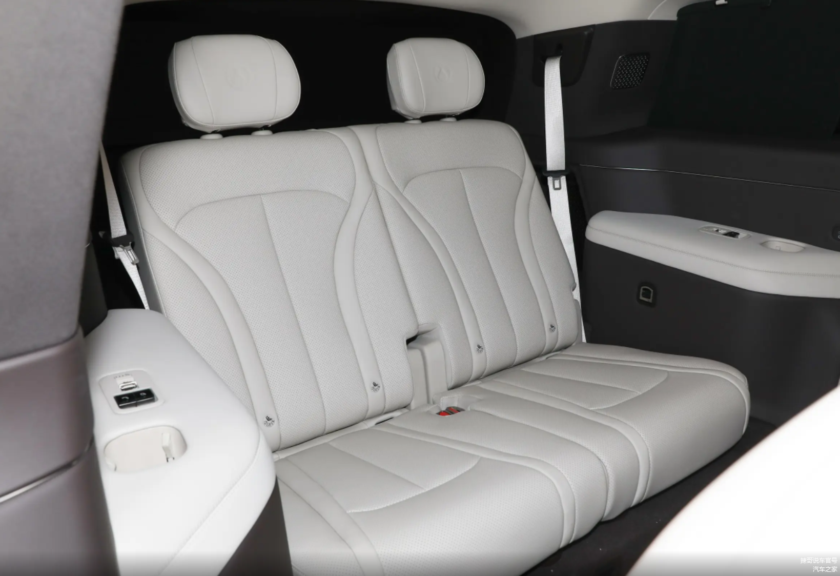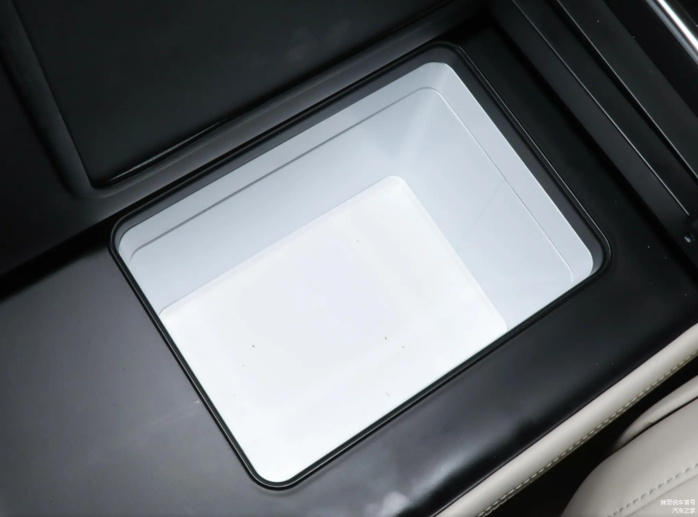 中央扶手也大,可以塞进一台冷暖冰箱,这台冰箱的供电系统直接联到了电池。同时,腾势N9还给到了吸顶式娱乐屏,可以给后排乘客带来很不错的娱乐体验,这是新能源全尺寸SUV必备的配置,否则怎么和问界M9、理想L9比豪华、比价值。