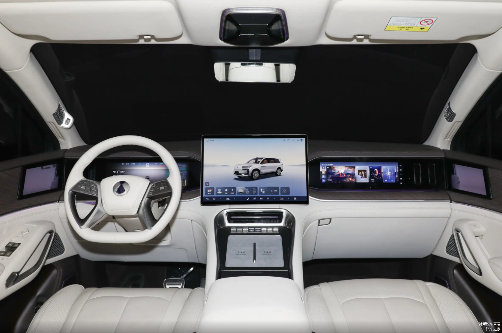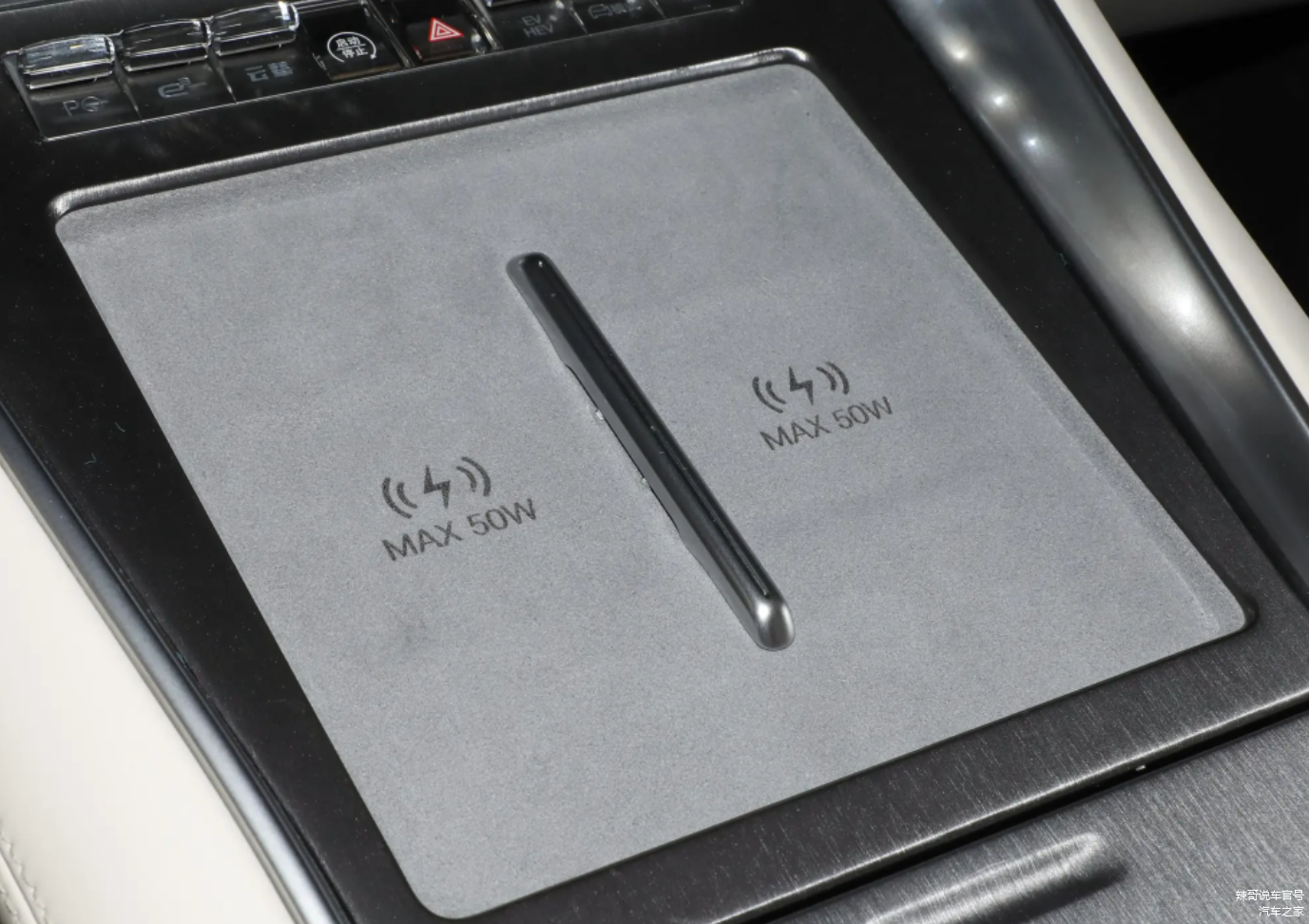 进入内饰,迎面就是5块大屏,仪表盘、中控屏、副驾驶位娱乐屏、以及两块布局在车门、用来观测后方环境的屏幕,其实还有一块AR-HUD抬显,5块硬件屏的组合摆在这里,中控台已经没有可以设计的区域。由于采用了怀挡设计,中岛区域的空间就比较大,给安排了两个50w的手机无线充电,