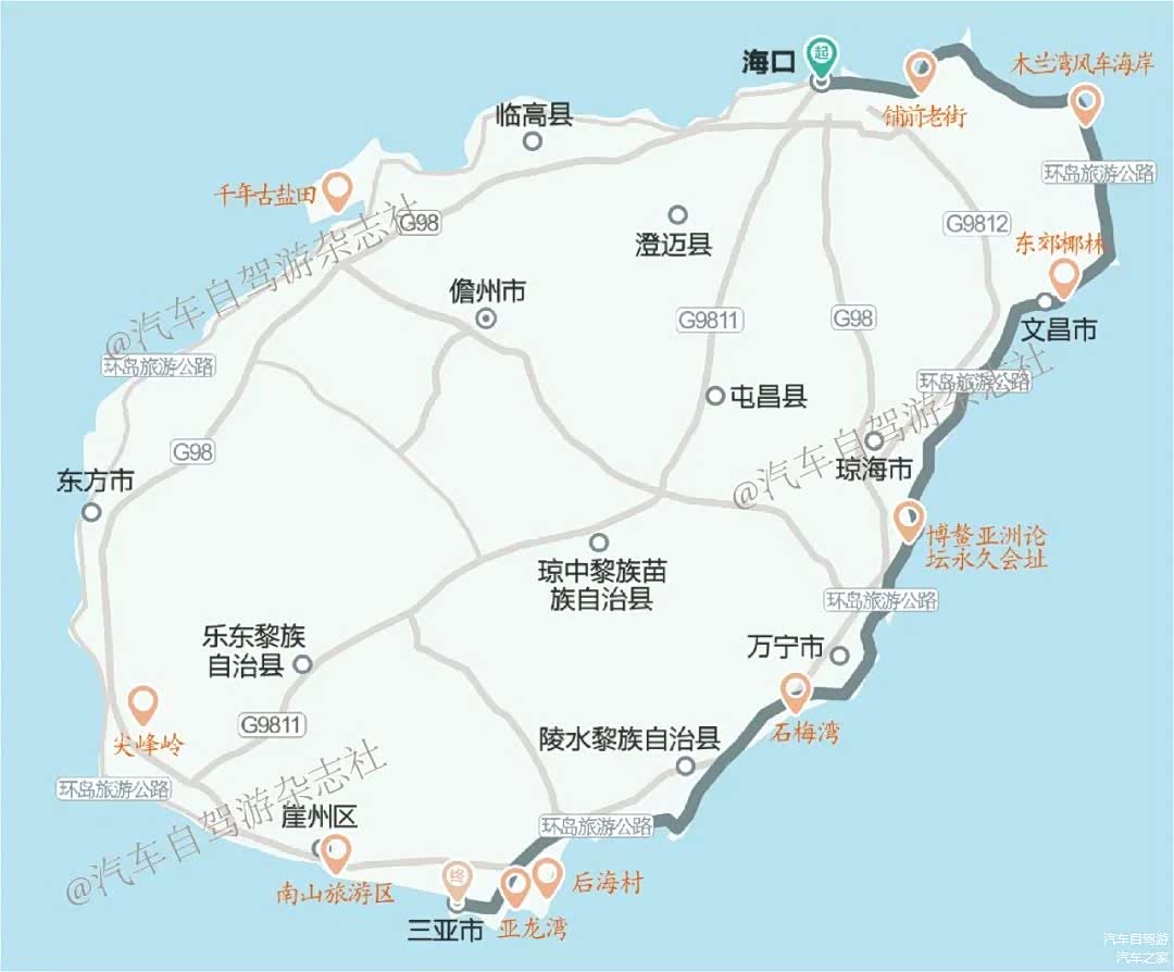 行车路线:海口市(环岛旅游公路)—160公里—文昌市(环岛旅游公路)—58公里—博鳌镇(海榆线、G98)—57公里—万宁市(G98)—24公里—神州半岛(G98)—99公里—后海村(G223、G224)—34公里—半山半岛帆船港