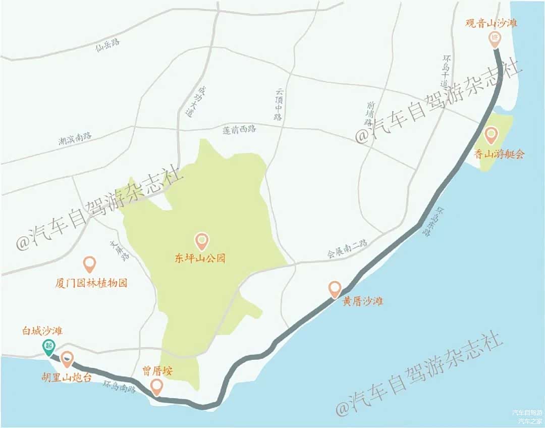 行车路线:厦门市(鹭江道、环岛路)—8公里—白城沙滩(大学路、环岛南路)—1公里—胡里山炮台(环岛南路辅路、环岛南路)—2公里—曾厝垵(环岛南路、观光旅游大道)—5公里—黄厝海滩(观光旅游大道、环岛东路)—7公里—观音山沙滩
