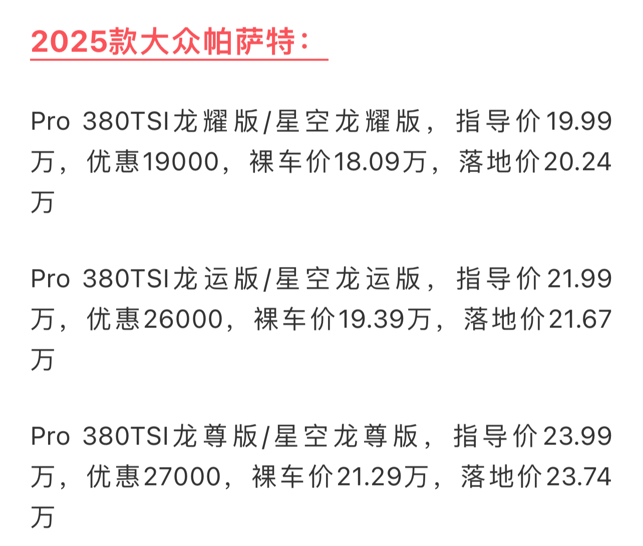 说车先说价,现在车市竞争太激烈了,B8版本的帕萨特已经沦为15万级别的车。可B9版本帕萨特毕竟是全新换代,价格方面还是有些端着的。现在入手帕萨特PRO龙耀版,终端能优惠1.9万,裸车18万出头,落地价格在20.24万左右。龙运版终端能优惠2.6万,实际裸车价19.4万左右,落地价格在21. 67万上下。高配龙尊版,终端的优惠更大,达到了2.7万,实际裸车价约21.3万,落地价格约23.74万。
