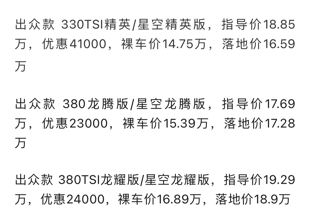 最后一个缺点,新款确实更有吸引力,不过和老款的差价也太大了点,都是380动力,B8龙腾版起售价17.68万,B9版本的起售价是19.99万。两万多的差价呢,老款380龙腾版优惠后裸车才15万出头呢,落地17万多,如果你是一个追求性价比的人,那新款帕萨特,可能对你来说就毫无吸引力了。