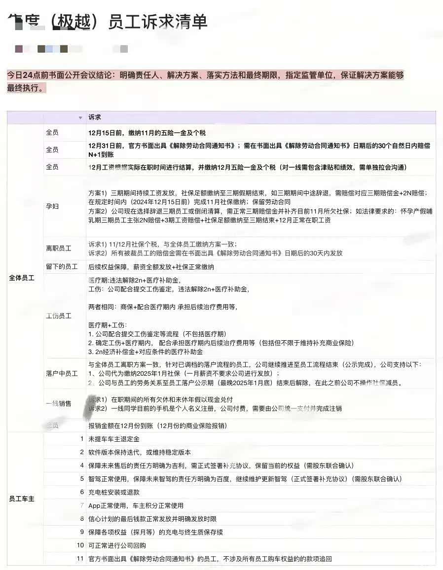 ▲极越员工提出的诉求清单不过,极越停摆正引发一系列连锁反应,已售车型的智驾功能ASD被停用,只有车道保持功能可用,而手机钥匙功能也被建议谨慎使用,在12月13日上午已经有车主代表奔赴极越上海公司总部。02.