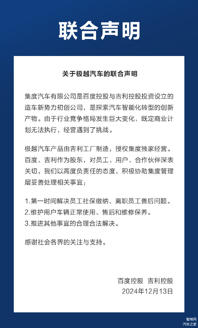 一份迟到的股东声明12月13日下午17时,在极越停摆48小时之后,极越汽车的两位大股东百度与吉利发布了联合声明表示,将第一时间解决员工社保缴纳、离职员工善后问题;维护用户车辆正常使用、售后和维修保养;并推进其他事宜的合理合法解决。
