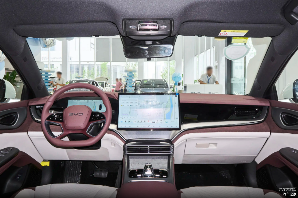 内饰方面:不仅外观采用了家族最新的设计理念,而内饰设计也同样如此,细节上还大量运用了更多圆润的线条,打造出环绕式的流动视觉体验。为了营造豪华感,海豹07 DM-i不仅采用米+酒红色的撞色设计,还应用了玫瑰真木装饰板、玻璃、哑光镀铬饰条等多种高档材质,而10.25英寸全液晶仪表采用包覆式设计,在强光下依旧显示清晰,且各功能区分明确,并且提供了W-HUD抬头显示系统。而四幅式平底方向盘尺寸适中,在亲肤皮质的覆盖下给到了非常棒的手感,样式也是全新的。